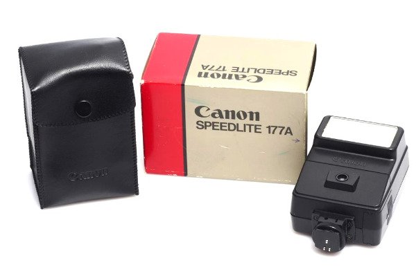 Flash automático original Canon modelo Speedlite 177A. Incluye CAJA, funda, y manual de instrucciones.