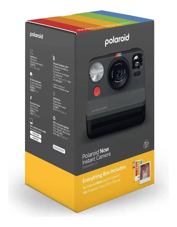 DESCRIPCIÓN: Captura y guarda tus momentos cotidianos para siempre con la Cámara de Película Instantánea Polaroid Now i-Type. Nuestra nueva cámara analógica instantánea de la Generación 2 está hecha con un 40% de materiales reciclados y la batería interna de litio-ion se carga a través de USB-C. La Polaroid Now Generación 2 incluye un sistema de enfoque automático de doble lente y un flash amigable con los humanos para ayudarte a capturar la vida mientras la vives en el icónico estilo Polaroid. La Polaroid Now Generación 2 está repleta de características adicionales para una creatividad ilimitada, incluyendo temporizador y modo de Doble Exposición, permitiéndote enmarcar dos momentos en una imagen icónica. La Polaroid Now Generación 2 está disponible en 4 colores vibrantes incluyendo Negro, Panda, Rojo y Azul. Se incluye correa para el cuello y cable de carga USB. Compatible con película i-Type y 600. Película vendida por separado.